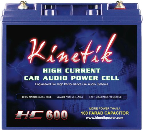 Kinetik HC600 - 600 Watt 12 Volt Power Cell Battery is more powerful than 100 1 farad caps! Extreme power in a small package. Mount near your amplifier for 800 amps of power reinforcement. Easily starts a V8 engine! Engineered for high performance car audio systems, but graceful for normal driving conditions. Kinetik HC Power Cells are used in the "Worlds Loudest Vehicle" providing the power to reach over 180dB and boasts hundreds of competition victories! Due to low ESR (Equivalent Series Resistance) and high energy density, Kinetik HC Power Cells are the most powerful, reliable and compact car audio power cells on the market today. Kinetik Power Cells are used by top competitors along with car audio and video enthusiasts alike. With the rapidly growing voltage demands of todays hi-current amplifiers you will want Kinetik HC Power Cells pushing them to their limits. Kinetik Power Cell Batteries deliver higher peak amps faster and provide up to twice the life of conventional batteries. They are suspended with fiberglass mat separators, which act as absorbent sponges to deliver maintenance-free, hi-performance with a no leak design, higher cranking amps, lower self discharge and greater vibration resistance.
